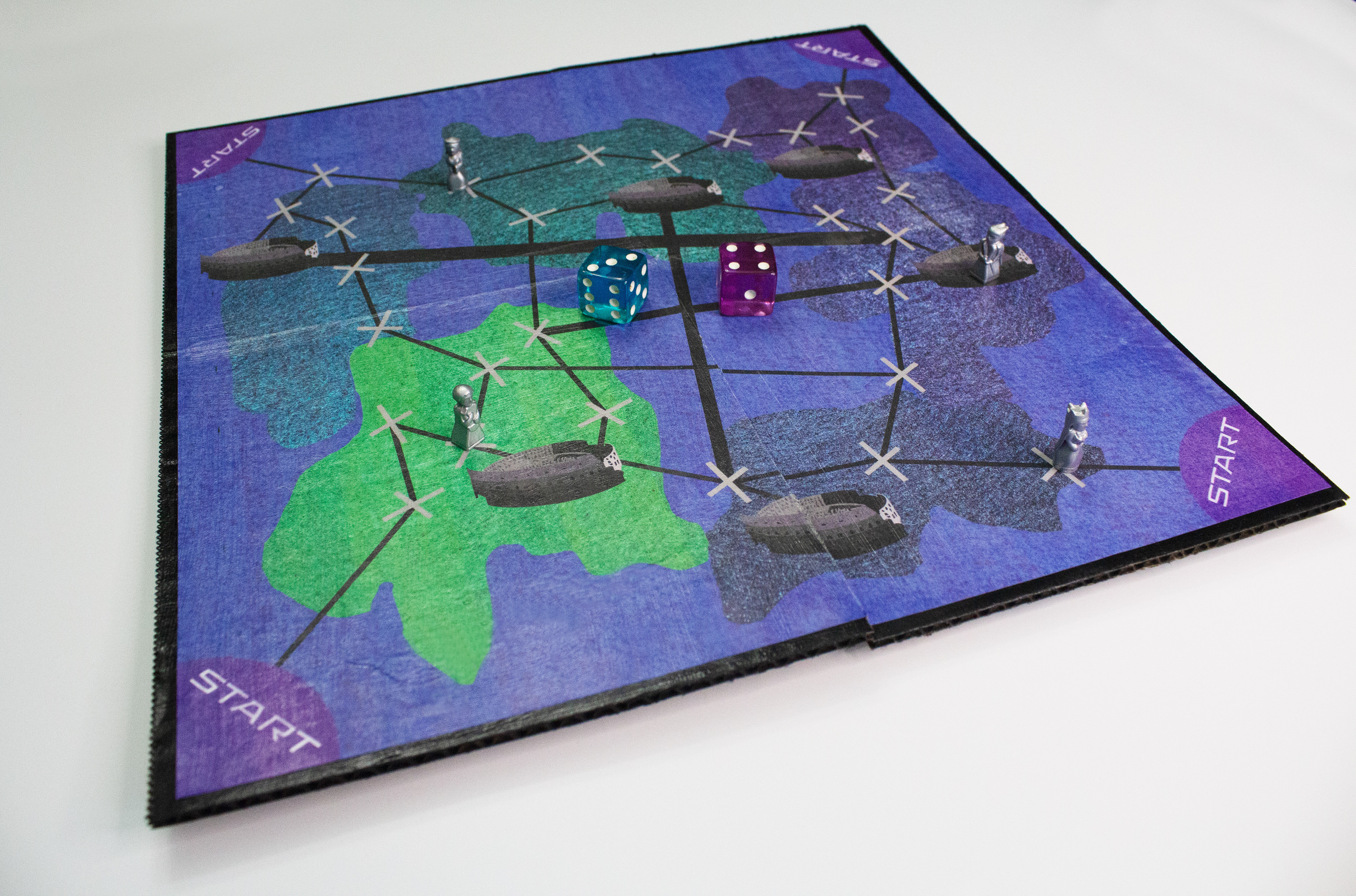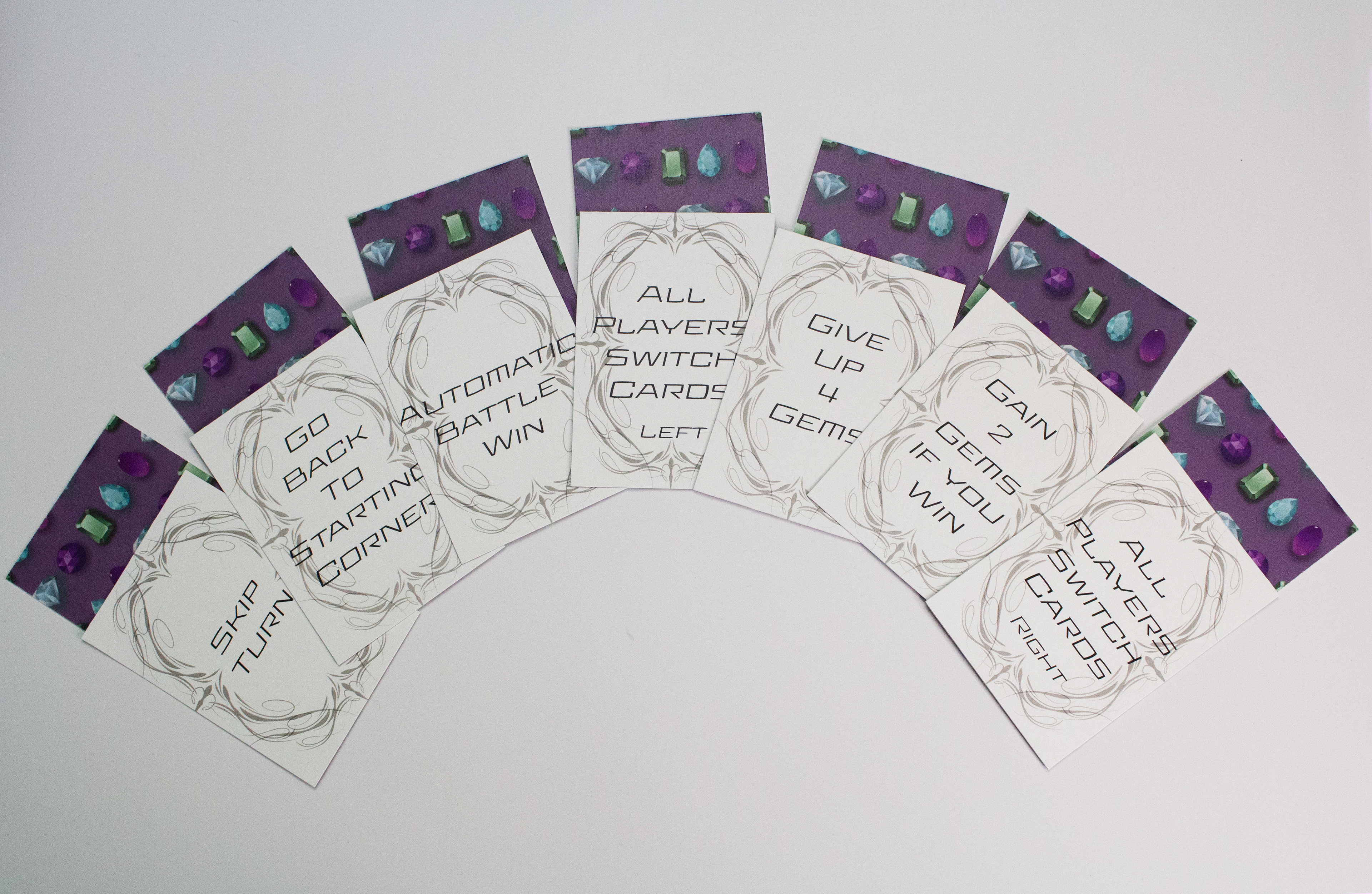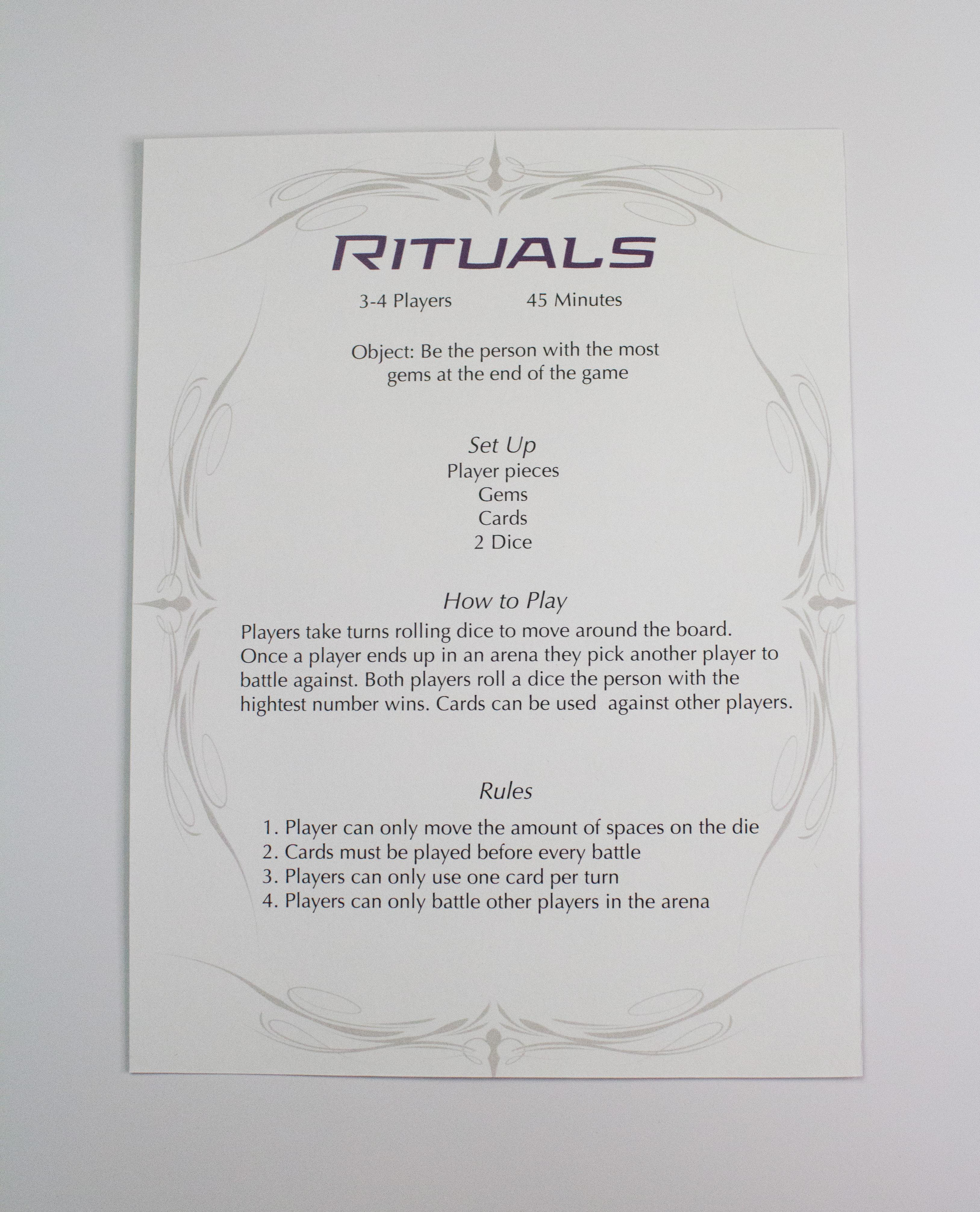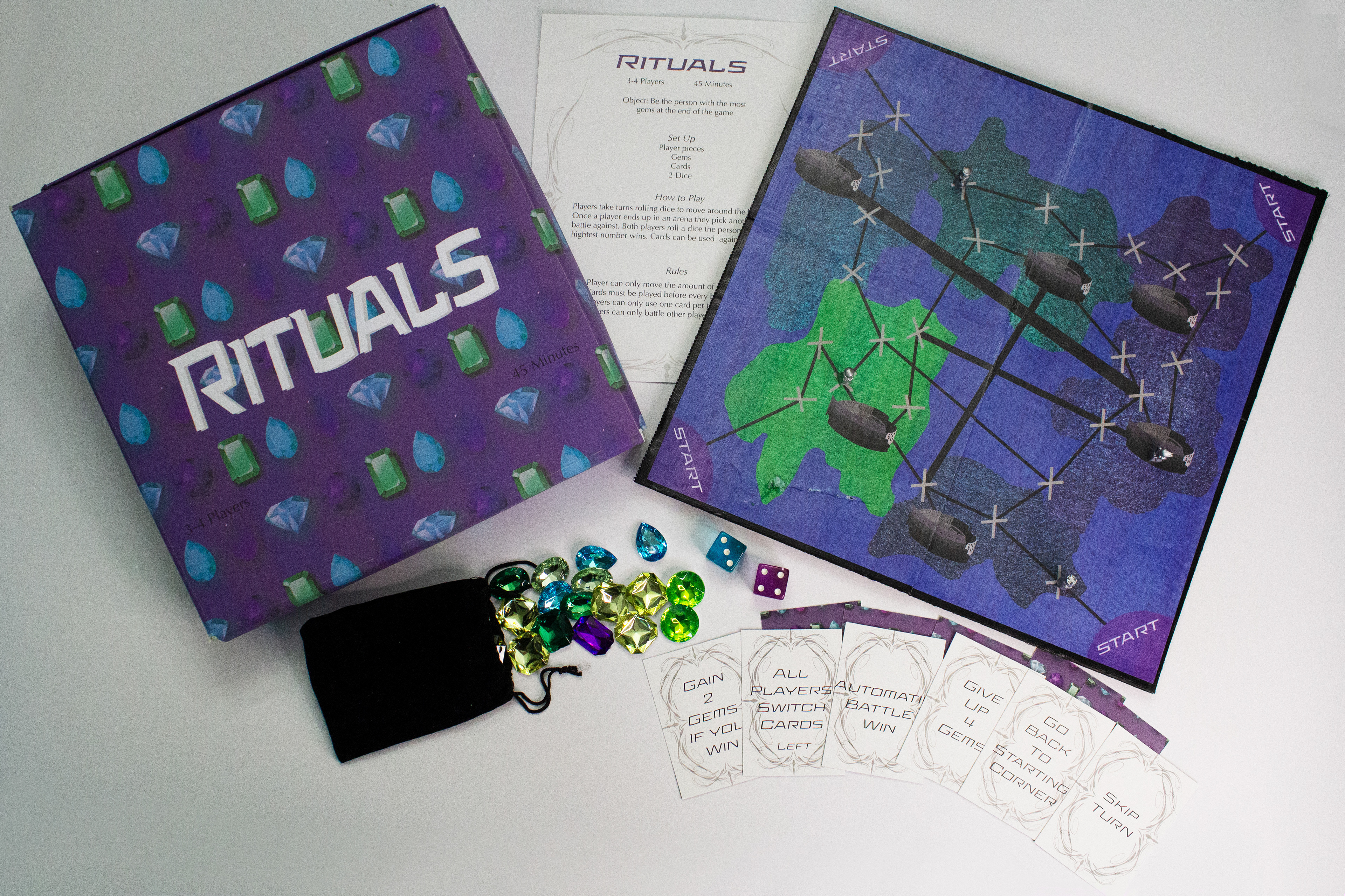 Rituals is a 3-4 person dice battle game. Players roll around a board to battle other players to try and win gems. The player with the most gems at the end wins.